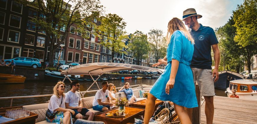 Der neueste Zuwachs im Fuhrpark ist die vielseitige Elektro-Schaluppe Pure Spirit. Er eignet sich hervorragend für größere Gruppen und bietet mit dem Aufstelldach eine Lösung für Regen und Schatten. Neben den großzügigen Sitzgelegenheiten auf den luxuriösen Sofas hat Pure Spirit einen großen Kühlschrank mit unserer großen Getränkeauswahl, einen Barbereich und eine Toilette an Bord. Angesichts der Corona-Maßnahmen hat sie Platz für 8/10 Gäste.
