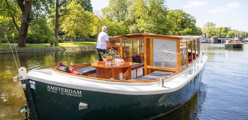 Get to know Amsterdam's first indoor luxury Salonsloep. The Havana is very spacious, there is a full toilet on board and there is a possibility to partially open. Both the front section and the rear terrace can be opened. The boat also has 2 large roof hatches that can be opened completely. As you can see a multifunctional boat. The Havana is very suitable for various occasions such as a wedding, (company) drink (30 pers), luxury 3-course dinner (14 pers) or together with friends and family to BBQ-en