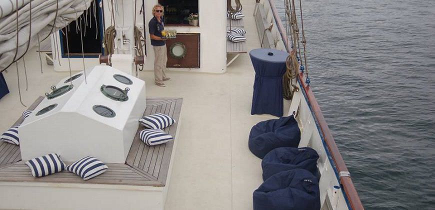 Bovendeks kunt u genieten van vaartocht. Maak het u gemakkelijk met de vele zitzakken en kussens, of ga actief meezeilen en navigeren als dat meer in uw straatje ligt.
